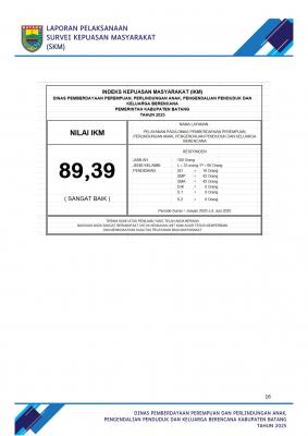 Berdasarkan hasil pengolahan dan analisis data, DP3AP2KB Kabupaten Batang memperoleh Nilai Indeks Kepuasan Masyarakat (IKM) sebesar 89,39 dengan kategori Sangat Baik. Capaian ini menunjukkan bahwa pelayanan yang diberikan telah memenuhi harapan masyarakat dan mengalami peningkatan dibandingkan tahun sebelumnya.